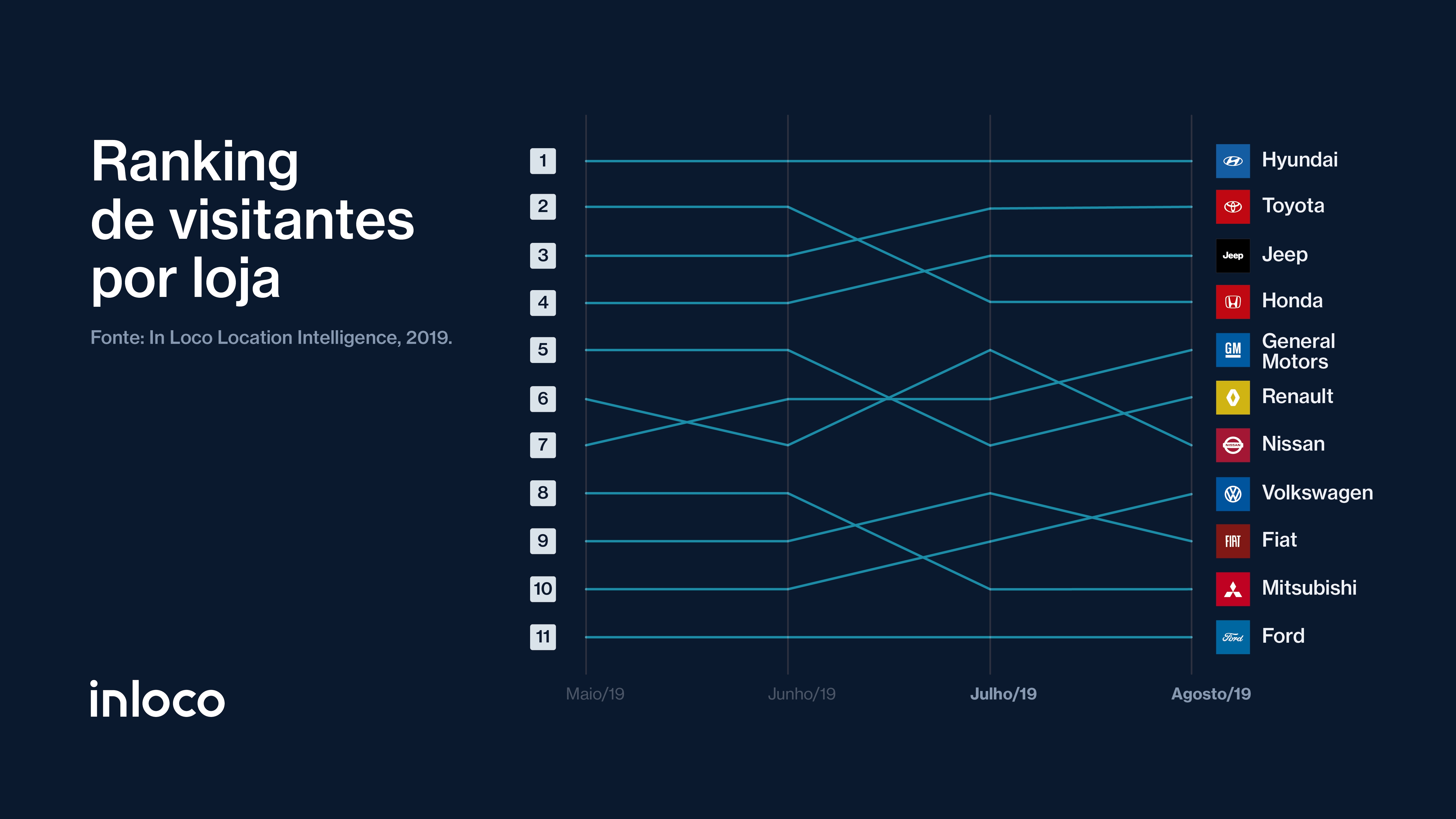 Desde o início de 2019, Hyundai, Renault e Ford disputam mês a mês pelo quarto melhor lugar do ranking das marcas com maior volume de visitas registradas em suas lojas. Em julho deste ano, após ultrapassar a Renault, a Hyundai levou a melhor e recuperou a posição que perdeu em fevereiro deste ano.
