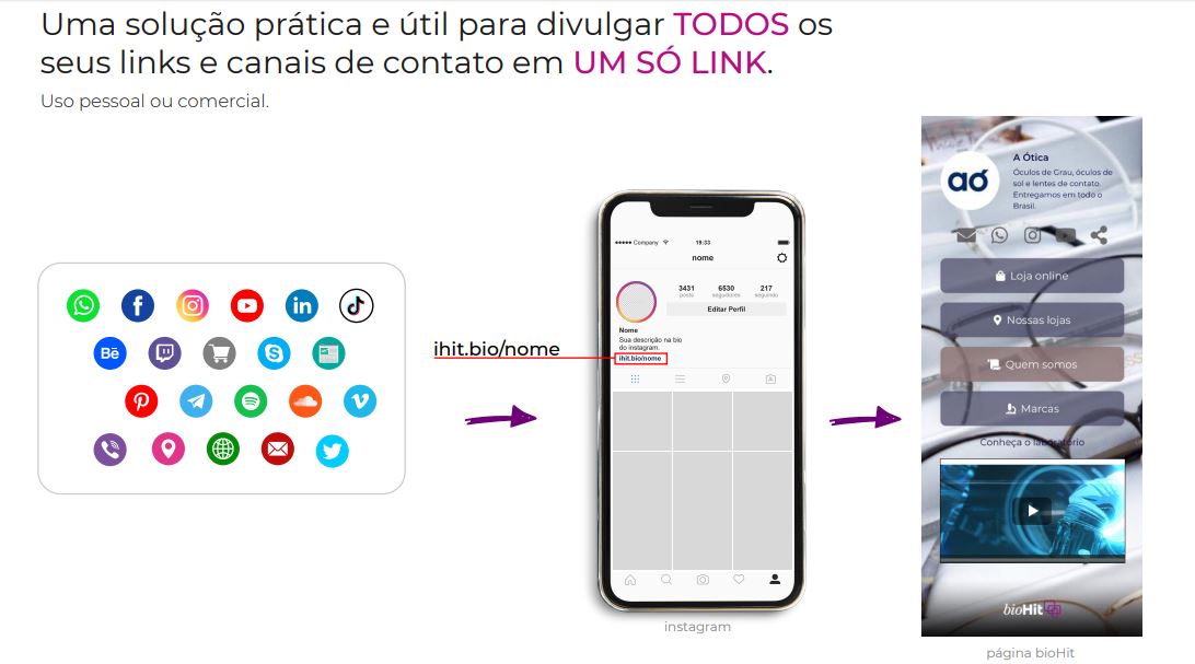O bioHit, que acaba de ser lançado no Brasil pela iHit, empresa de Itajaí/SC, é um link curto e prático que possibilita pessoas ou empresas resumirem a um único clique o acesso a todas as redes sociais, e diversas outras conexões online, que tragam informações que queiram divulgar sobre si, ou sobre seu negócio. Com uma operação simples e intuitiva, o bioHit foi criado para ser um organizador de pontos de contato online, através da criação de um link único, que pode ser publicado na biografia de redes sociais, assinaturas de e-mail, compartilhado como um cartão de visitas digital ou até ser uma opção de site, entre outras possibilidades.