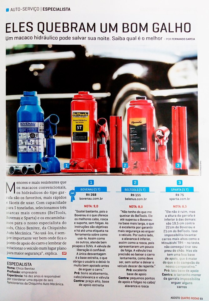 A Bovenau, empresa rio-sulense, com 28 anos de história sendo líder de vendas e fornecimento de macacos e equipamentos hidráulicos na América do Sul, teve o macaco hidráulico avaliado pelo especialista Chico Benitez, empresário que há 10 anos é responsável por coordenar uma equipe de seis funcionários da Chiquinho Auto Mecânica.