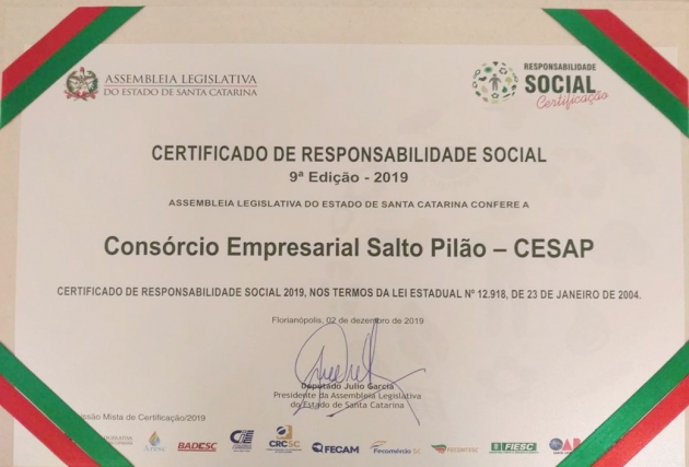 O Consórcio Empresarial Salto Pilão (CESAP) recebeu na noite de segunda-feira (2/12), em Sessão Especial na Assembleia Legislativa de Santa Catarina (Alesc), o Certificado de Responsabilidade Social que visa reconhecer e destacar o trabalho de organizações sem fins lucrativos e empresas públicas e privadas com atuação em território catarinense, que tenham ações sociais e para a preservação do meio ambiente incluídas em suas políticas de gestão.