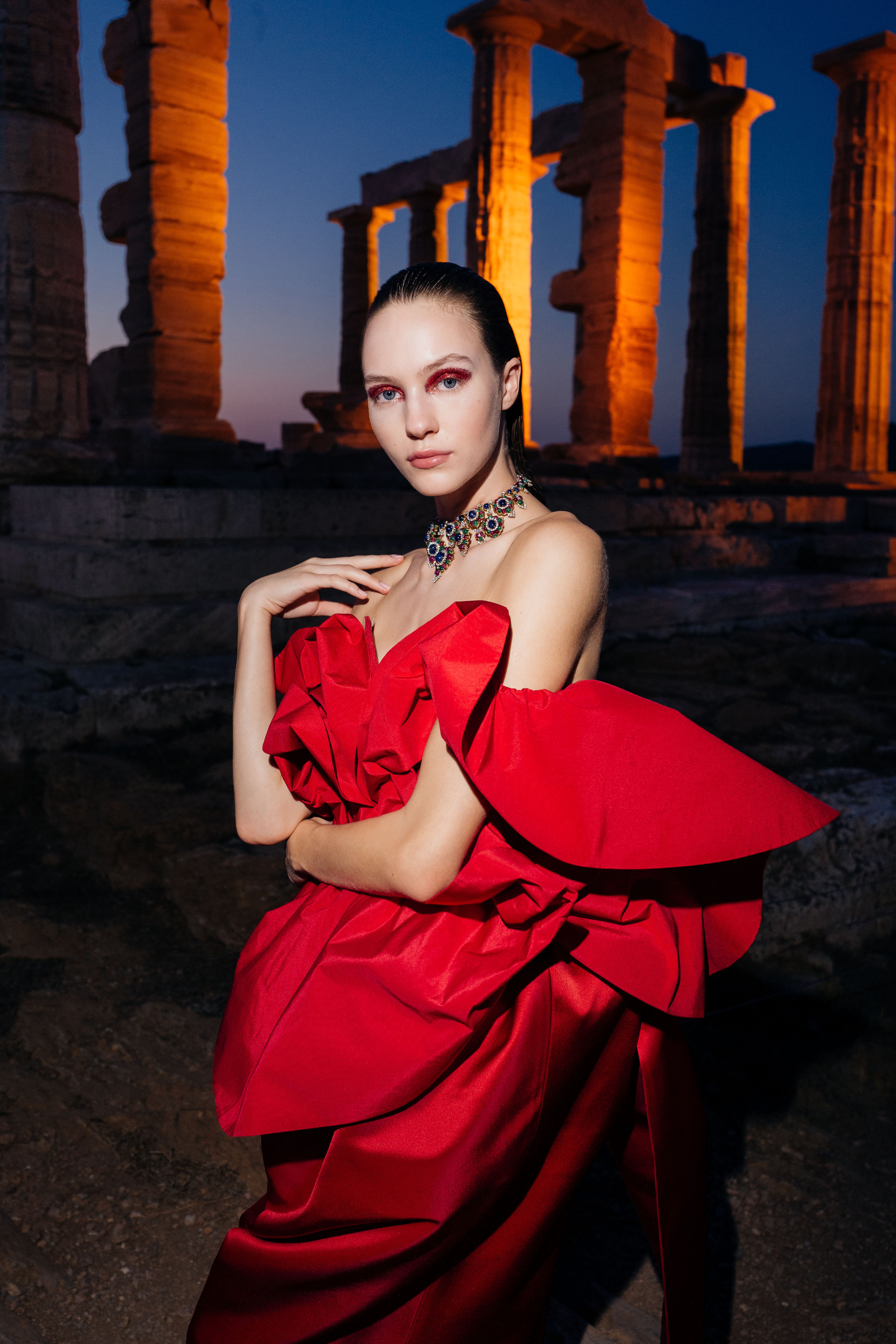 O desfile aconteceu em um cenário de tirar o fôlego do antigo Templo de Poseidon, em Cape Sounion, um promontório construído entre 444 e 440 A.C. e a 200 pés acima do mar Egeu. O Templo de Poseidon é um dos principais monumentos da Era de Ouro de Atenas e é a primeira vez que um desfile de moda é realizado em torno deste patrimônio histórico.