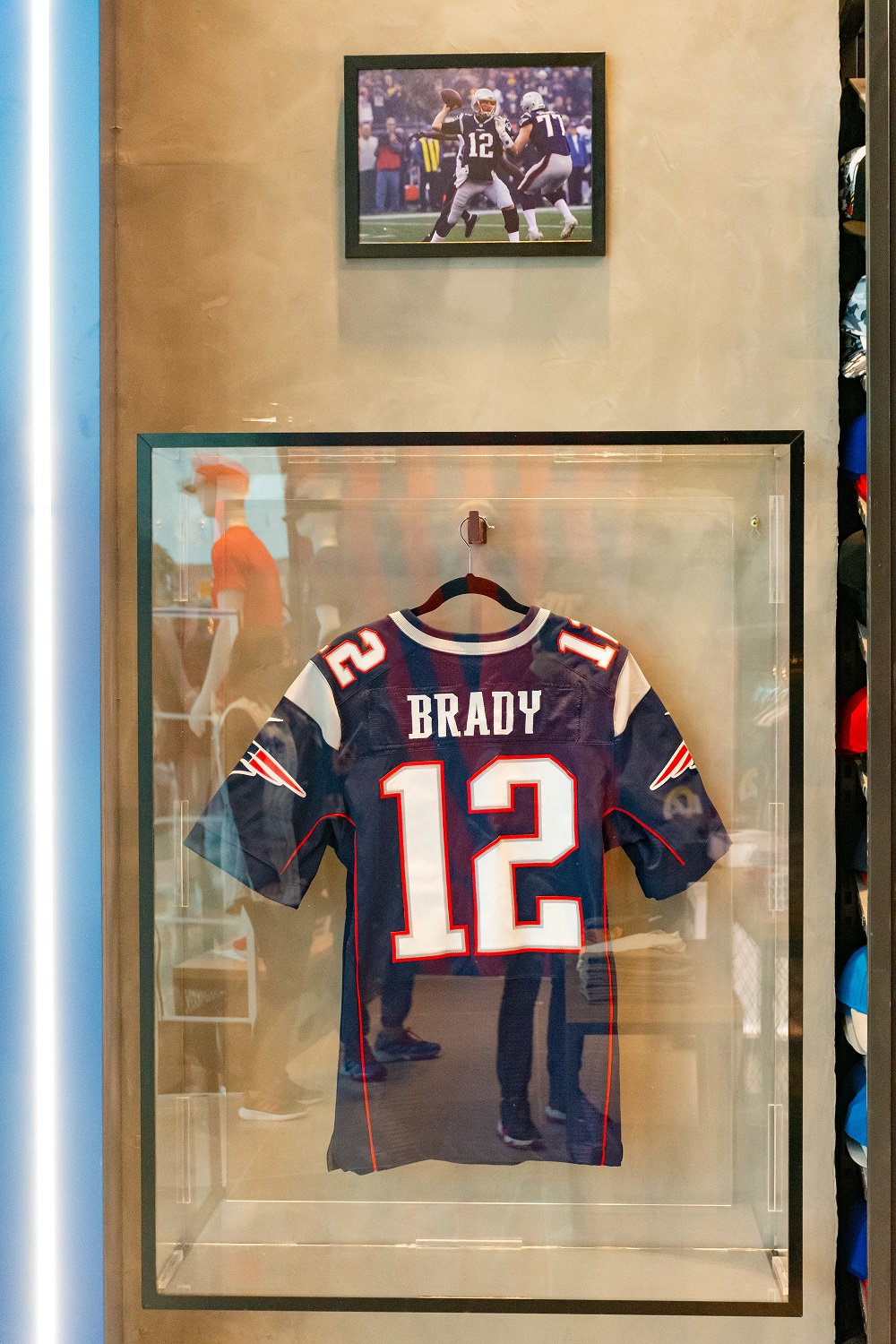 Falando em Tom Brady, outra cortesia da NFL para a Sport America é a jersey usada pelo atleta quando atuava pelo New England Patriots. Brady é dono de diversos recordes da NFL, sendo o principal deles o de quarterback que mais vezes venceu o Super Bowl, vencendo sete das dez finais disputadas (seis vezes pelos Patriots e uma vez pelos Buccs).