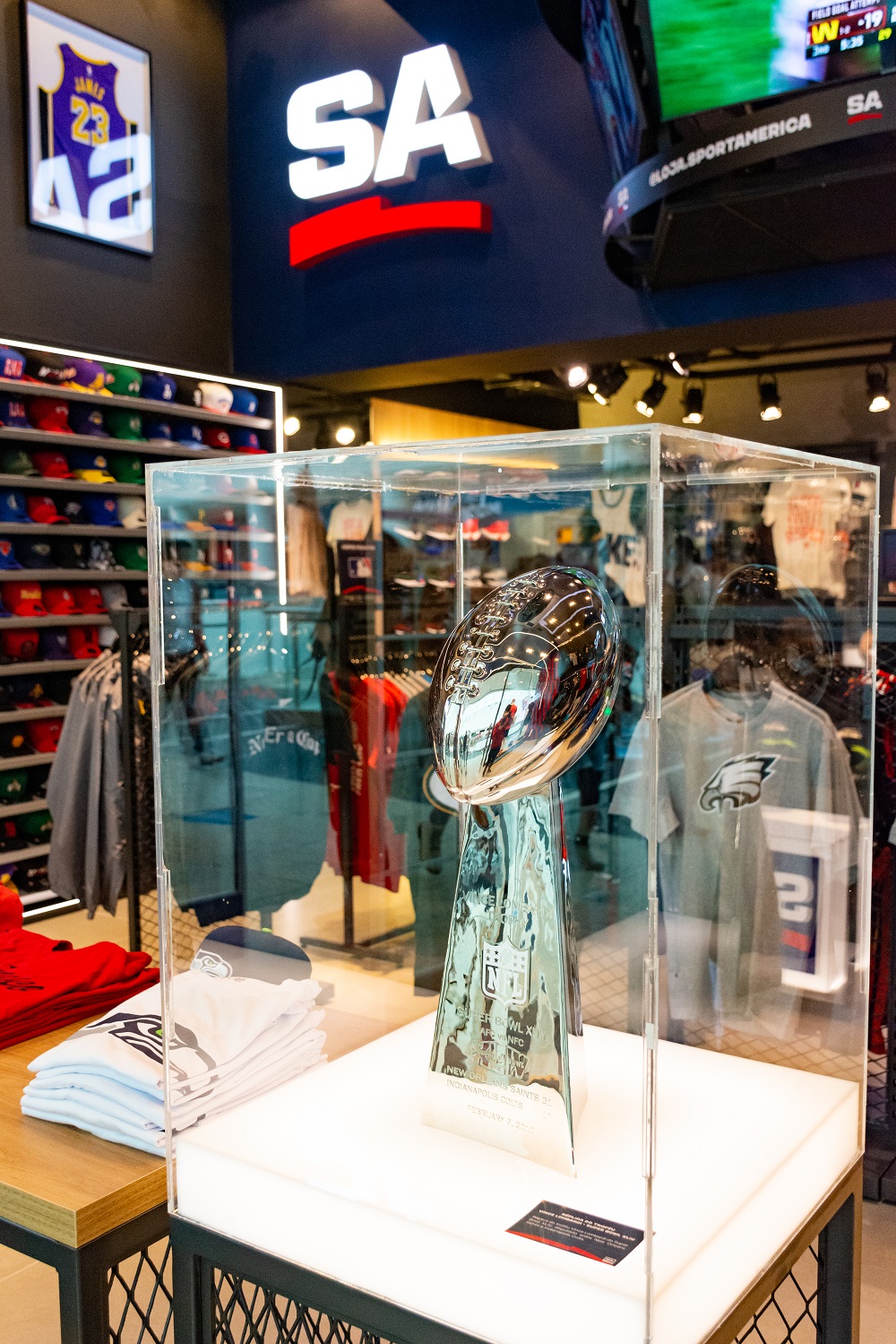 “Temos aqui, sem a menor dúvida, a maior memorabília da NFL na América do Sul”, conta Marcelo Bevenuto, sócio-fundador da Sport America. Entre as grandes estrelas da loja estão uma réplica do troféu Vince Lombardi, do Super Bowl XLIV, e uma jersey de jogo de Tom Brady, um dos maiores nomes da história do esporte.