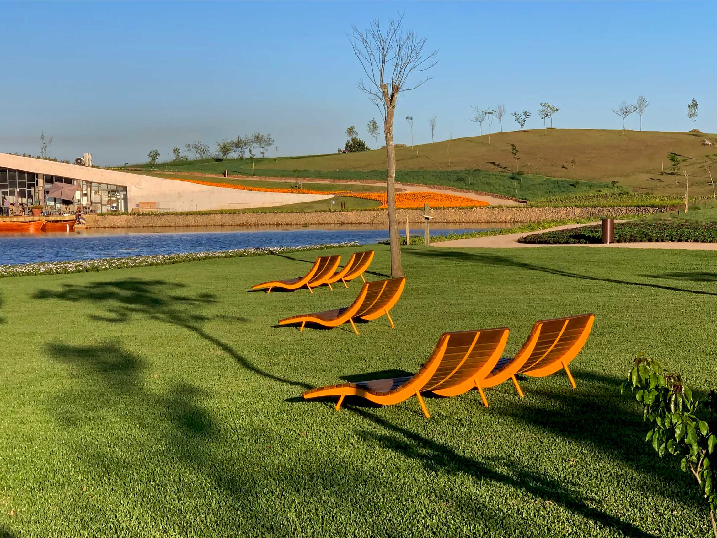 “A partir da leitura do terreno, identificamos traços e elementos naturais que deveriam se manter presentes como estruturantes de todo o projeto. Na macro escala, as linhas da topografia estabeleceram as formas dos caminhos. O grande lago foi eleito como elemento central, as áreas alagadiças foram preservadas como jardins naturais e a mata foi incluída no percurso dos visitantes. Na micro escala identificamos a vocação da flora nativa e estudamos as combinações possíveis”, explica Juliana, sócia de Clarice Castro no escritório JA8 Arquitetura Viva.