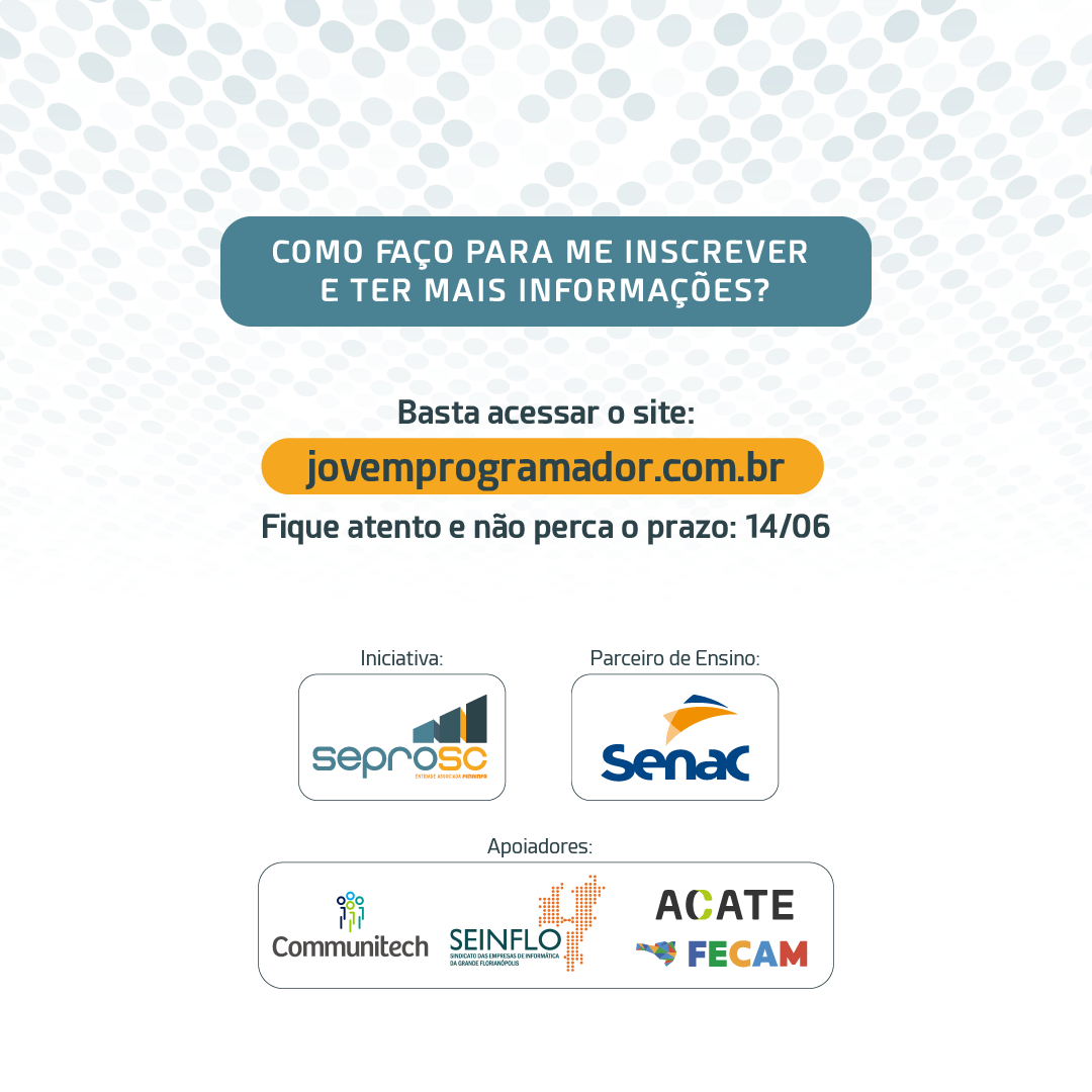 Estão abertas as inscrições para o recém-lançado Jovem Programador, projeto de capacitação profissional na área de tecnologia que une jovens de 16 a 25 anos e empresas catarinenses. Os interessados poderão se inscrever até o dia 14 de junho pelo site www.jovemprogramador.com.br.