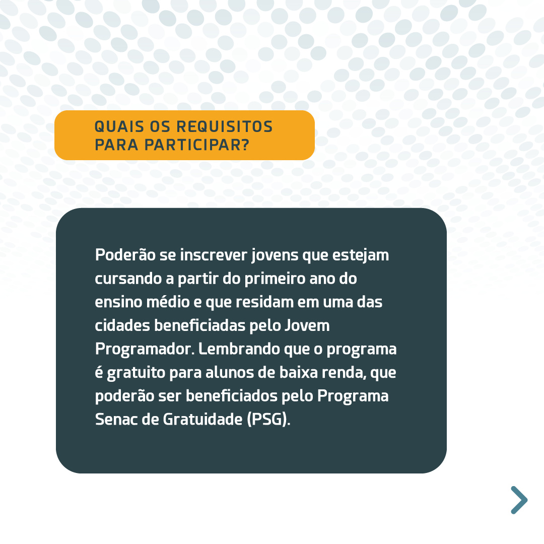Lembrando que o Jovem Programador é gratuito para alunos de baixa renda, que poderão ser beneficiados pelo Programa Senac de Gratuidade (PSG), que tem como objetivo garantir o acesso à educação profissional para pessoas com renda familiar per capita de até 2 salários mínimos.