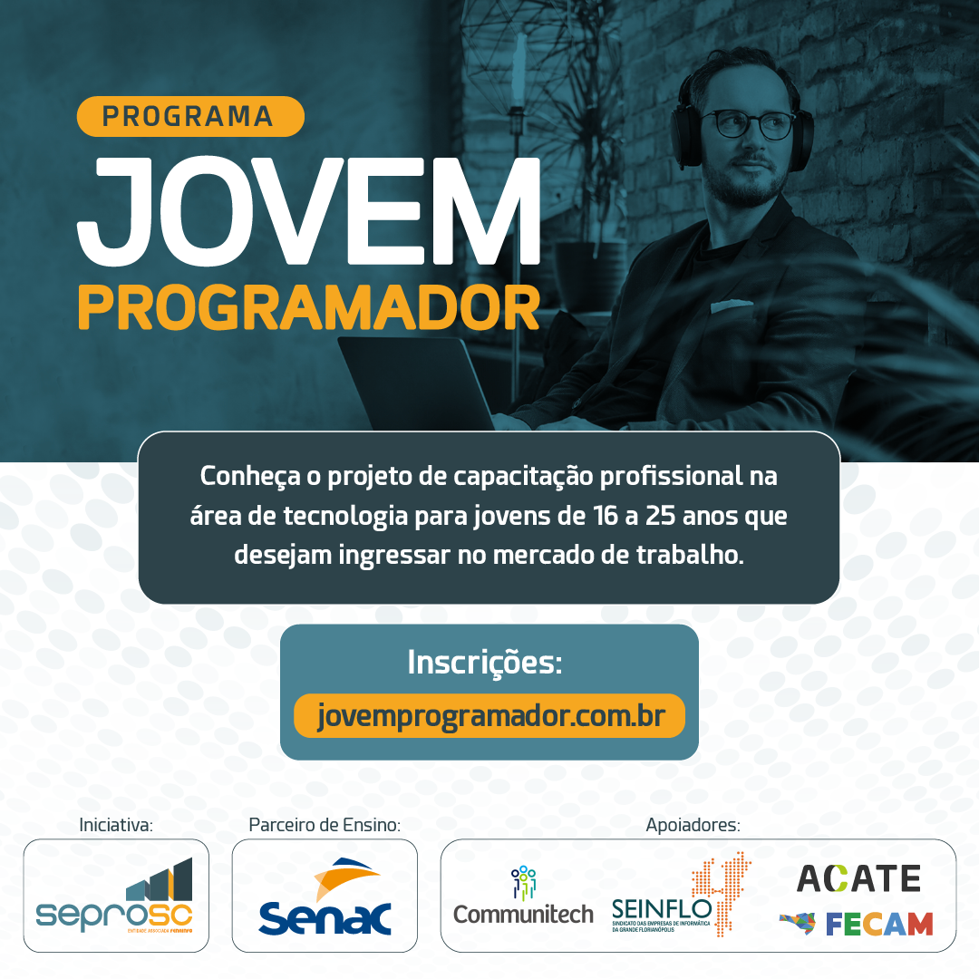 O Jovem Programador é uma iniciativa do Seprosc (Sindicato das Empresas de Informática, Processamentos de Dados e Tecnologia da Informação do Estado de Santa Catarina), em parceria o Senac SC, responsável pela área de ensino, com apoio do Seinflo (Sindicato das Empresas de Informática da Grande Florianópolis), Communitech (Sindicato das Empresas de Processamento de Dados e Informática de Joinville), Acate (Associação Catarinense de Tecnologia) e Fecam (Federação Catarinense de Municípios). O programa traz, ainda, o patrocínio da WK Sistemas, Datainfo e Fácil.