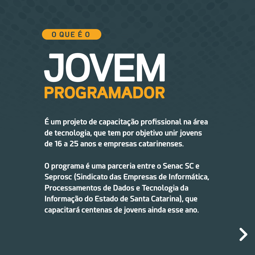 Para Juliano Vieira, coordenador do projeto no Senac SC, este programa será fundamental para reduzirmos o gap da qualificação no ecossistema catarinense e alavancar o desenvolvimento tecnológico no Estado: “Além da qualificação profissional, o Jovem Programador também vai auxiliar estes jovens a conseguir uma colocação no mercado de trabalho, com uma proposta que dá ênfase ao teletrabalho ou home office, permitindo que os jovens capacitados pelo curso possam ser contratados por empresas em toda Santa Catarina”.