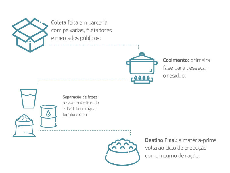 - Destino Final: E para finalizar a matéria-prima está pronta para voltar ao ciclo de produção, como insumo de ração para peixes, camarões e pets de alta qualidade.