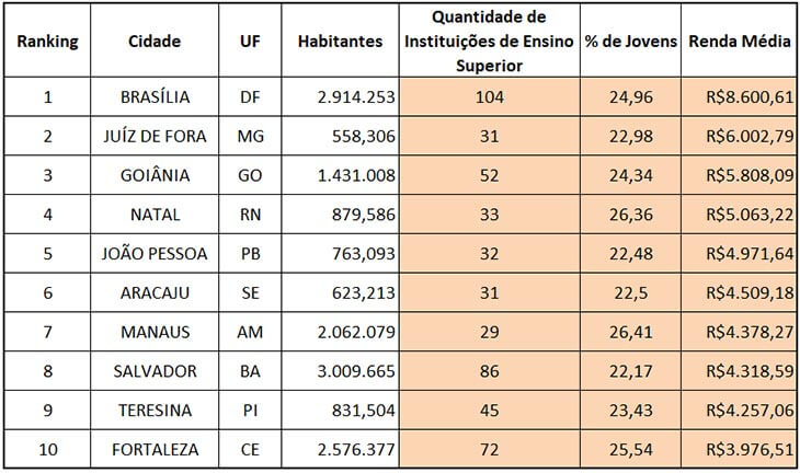 Para a montagem do ranking, as 20 primeiras cidades do país em quantidade de instituições de ensino foram analisadas quanto à concentração de público jovem versus a população total do município. A seguir, os 10 primeiros municípios com maior concentração de jovens foram ranqueados de acordo com a renda média domiciliar. Brasília, por exemplo, conta com 104 instituições, tem um percentual de jovens de 25,96% – um a cada quatro moradores encaixa-se no perfil – e renda média familiar de R$ 8,6 mil.